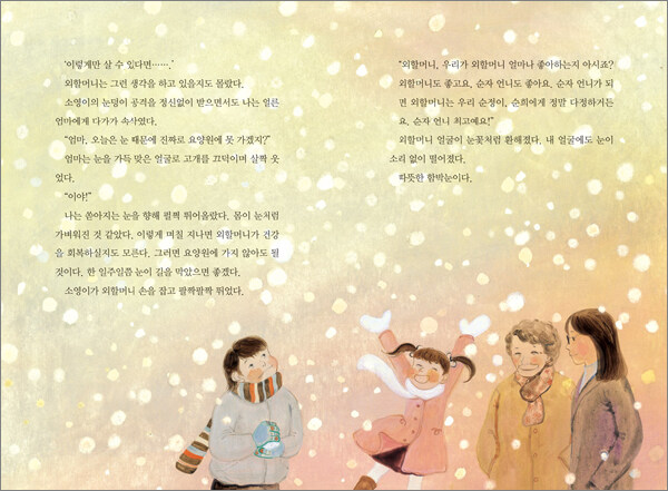 아빠 대신이라 생각했던 외할머니가 갑작스레 변하자 우영이와 소영이는 혼란스럽기만 합니다. 하지만 어렸을 때 이별한 동생을 기억하며 좋았던 시절로 되돌아가고자 하는 외할머니를 조금씩 이해하기로 하지요. 외할머니가 우영이 자매에게 든든한 버팀목이 되었듯 우영이와 소영이 또한 외할머니에게 귀엽고 예쁜 동생들이 되어 준 것입니다.
