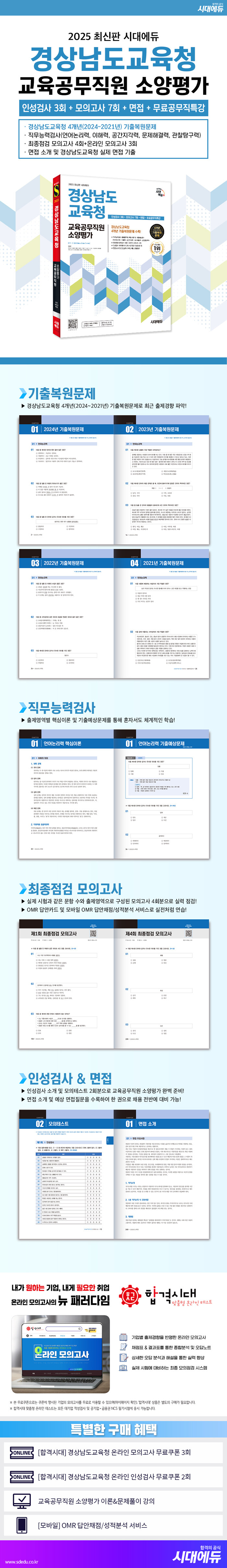 경상남도교육청 필기시험 합격을 위해 시대에듀에서는 2025년 채용을 대비하여 경상남도교육청 맞춤형 문제로 구성한 『2025 최신판 시대에듀 경상남도교육청 교육공무직원 소양평가 인성검사 3회+모의고사 7회+면접+무료공무직특강』을 출간하였다. 상세한 해설로 혼자서도 학습이 가능하도록 하였으며, 인성검사 및 경상남도교육청 온라인 모의고사를 무료로 응시할 수 있는 쿠폰을 발급하여 경상남도교육청 문제 유형에 대한 연습과 함께 자신의 실력을 최종 점검할 수 있도록 하였다.