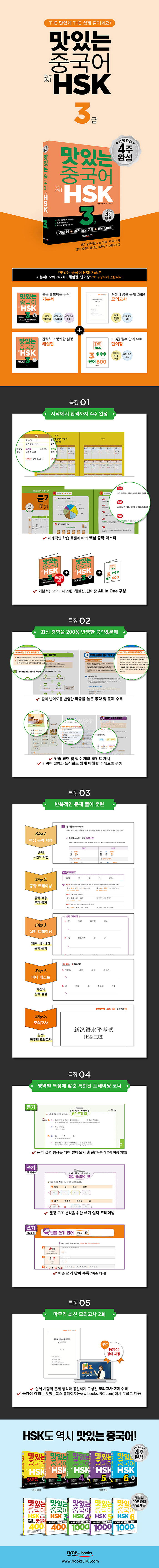 The 맛있게 The 쉽게 즐기세요!『맛있는 중국어 HSK 3급』은 한눈에 보이는 공략 「기본서(+모의고사 2회)」, 간략하고 명쾌한 「해설집」, 1~3급 필수 단어 600 「단어장」으로 구성되어 있습니다.