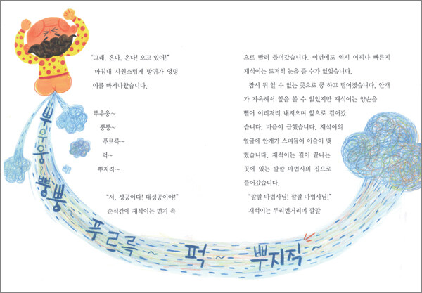 내용 요약재석이는 짠순이인 엄마 때문에 속이 상합니다. 엄마가 주워 온 옷을 입고 밖에 나갔다가 아이들에게 창피를 당하고, 민희 생일 때는 용돈을 다 썼다는 이유로 엄마가 생일 선물 살 돈을 주지 않아 생일 파티에도 가지 못합니다. 그래서 재석이는 돈이 아주 많았으면 하고 원합니다. 이런 재석이의 소원을 알아채고 깔깔 마법사가 재석이에게 마법 쪽지를 보냅니다. 재석이는 마법 쪽지에 적힌 대로 ‘뿌우웅~ 뿡뿡~ 푸르륵~ 퍽~ 뿌지직~’ 방귀를 다섯 번 뀌고 깔깔 마법사를 만나 재석이가 바라는 대로 돈이 아주 많아지는 마법을 얻게 됩니다. 맨 처음 아빠에게 마법을 걸어 돈이 생기게 된 재석이는 친구들에게 햄버거도 맘껏 사 주면서 인기를 얻게 되어 즐겁기만 합니다.