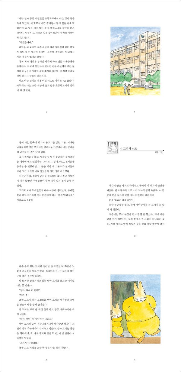 어린벚꽃 초등학교에서 벌어지는 환상 경험!나는 얼마 동안 어린벚잎 초등학교에서 야간 경비 일을 하였습니다. 요즘 세상에 야간 경비원을 두는 학교도 있나 싶었는데…… 이 학교는 뭔가 특별합니다. 거인이 학교 운동장을 찾아오고 라쿤이 머리를 감겨 주는, 그런 말도 안 되는 신기한 일들이 계속 일어나거든요. 도대체 어떻게 된 걸까요? 이 학교에 놀라운 비밀이라도 숨어 있는 걸까요?