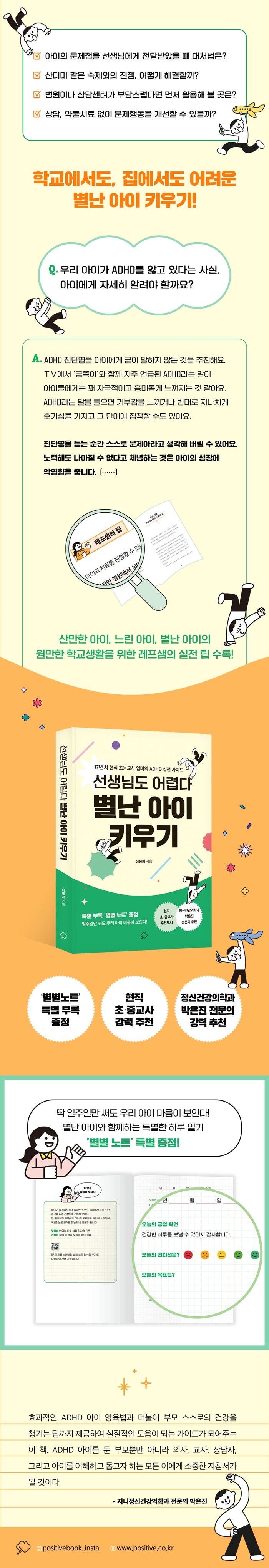 부록으로 수록된 ‘별별노트’는 감정 관찰지와 하루 한 줄 긍정 확언을 담아, 아이와의 하루를 다시 돌아보고 새로운 변화를 시도하게 만든다. 이는 아이가 몰입했던 순간, 감정이 흔들린 순간을 꾸준히 기록하며 행동 패턴과 감정의 트리거를 쉽게 발견할 수 있도록 돕는다.