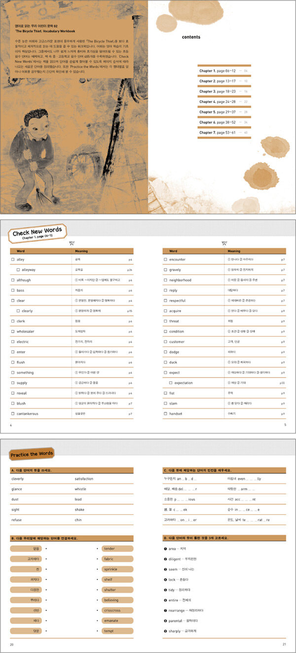 『The Bicycle Thief』는 「자전거 도둑」의 영어 번역본으로, 『이 세상에 태어나길 참 잘했다』의 영어 번역본인 『I Am So Happy I Was Born』를 번역하기도 한 하버드대학교 한국학 연구원이자 비교문학 박사인 전승희 번역가가 번역하였습니다. 문장의 일대일 번역 대신, 전체 글의 맥락에서 의미를 파악하고 읽기에 몰입할 수 있도록 우리말 원문과 영어 번역문을 나누어 실었습니다. 또한 『The Bicycle Thief』를 보다 효율적이고 체계적으로 읽는 데 도움을 줄 수 있도록 어휘 워크북을 함께 구성하였습니다.
