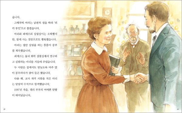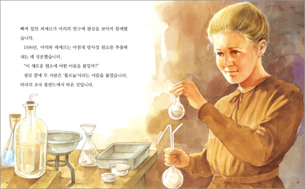 마리 퀴리가 태어났을 무렵 폴란드는 러시아의 식민지였어요. 학교에서도 폴란드의 역사가 아닌 러시아의 역사를 배워야 했고, 러시아 말만 써야 했습니다. 마리 퀴리는 어렸을 때부터 힘없는 조국, 폴란드를 위해 온 힘을 쏟겠다고 다짐했다고 해요. 그래서 파리로 유학을 떠나 누구보다 열심히 공부했고, 물리학과 수학 학사 시험에 합격했습니다. 그러던 중 뛰어난 재능을 가진 과학자 피에르를 만나 결혼을 하게 되지요. 두 사람은 폴로늄과 라듐이라는 원소를 발견한 공로로 노벨 물리학상을 받았답니다. 이후 남편이 세상을 떠난 뒤에도 연구를 계속해서 마침내 노벨 화학상까지 수상하게 되었지요. 어린 시절 바람대로 조국 폴란드를 빛낸 마리 퀴리! 그녀의 열정적이고 감동적인 삶 속으로 떠나 보세요.