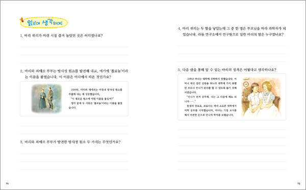 끊임없는 노력으로 노벨상을 두 번이나 받은 위대한 여성 과학자!마리 퀴리는 여성 최초로 노벨상을 두 번이나 받은 위대한 과학자입니다. 프랑스의 천재 물리학자 피에르와 방사능을 연구하며 과학 분야에 대단한 업적을 쌓았지요. 사고로 남편을 여읜 뒤에도 두 딸을 훌륭하게 키우는 한편 연구를 멈추지 않았던 인물이에요. 그 뿐만 아니라 제1차 세계 대전이 일어나자 엑스선 차량으로 부상당한 사람들을 진료하러 다니기도 했습니다. 과학에 대한 열정과 인류에 대한 이와 같은 사랑 덕분에 그녀는 오늘날까지도 많은 사람들에게 존경을 받고 있습니다.