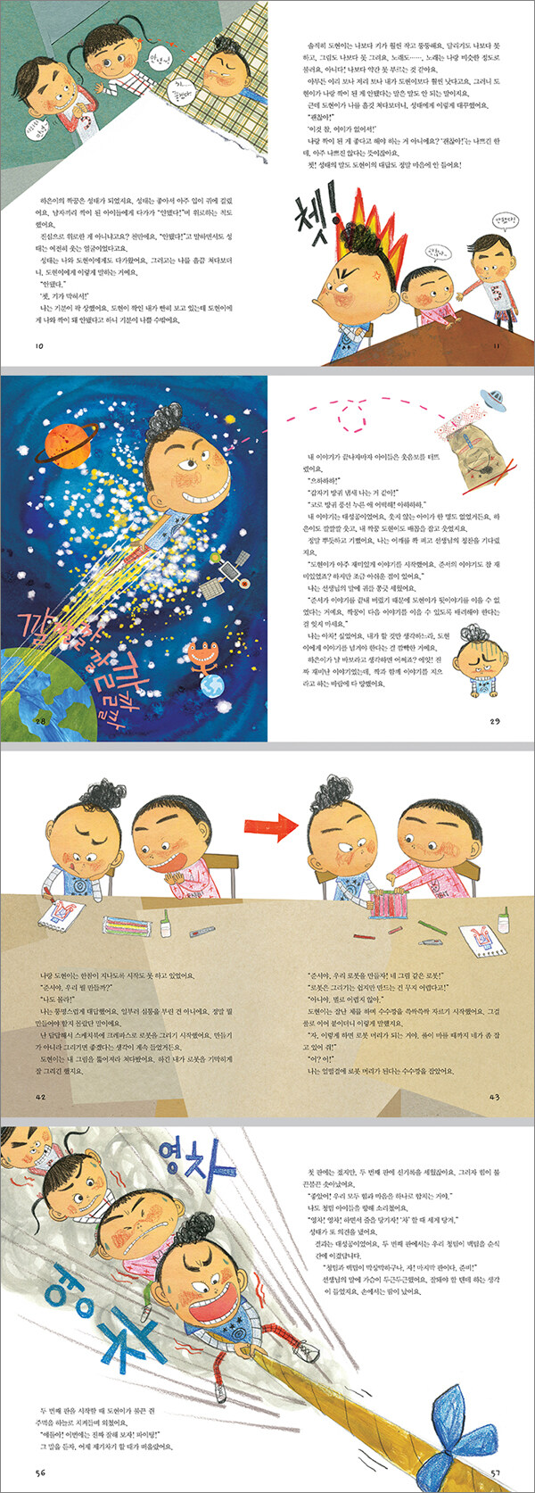 협동은 긍정적인 친구 관계와 상호 신뢰감을 향상시키는 열쇠이 책의 주인공 준서는 선생님이 왜 자꾸 짝꿍이랑 뭘 하라고 시키는지 알 수가 없다. 자기는 혼자서 뭐든 잘할 수 있는데, 게다가 짝꿍인 도현이는 자기보다 잘난 것도 하나 없는 것 같은데 말이다. 도현이도 허구한 날 같이 놀자, 같이 뭘 하자고 하는 통에 성가셔 죽을 지경이다. 그런데 어느 날은 못 이기는 척 제기차기를 함께 해 보니 의외로 재미가 있다. 재미있다고 인정할 만큼인지는 모르겠지만. 미술 시간에 수수깡으로 만들기를 하는데, 유일하게 자신 없는 항목인 ‘만들기’가 짝꿍 도현이의 아이디어 덕분에 술술 풀리기 시작한다. 멋지게 완성된 수수깡 로봇은 선생님과 친구들의 칭찬도 받는다. 준서에게도 긍정적으로 ‘협동’을 경험할 기회가 생긴 것이다. 도현이가 먼저 내민 손을 준서도 살며시 맞잡은 것이다. 동화 속에는 나오지 않지만, 마지막 부분에 들어 있는 ‘준서의 협동 일기’를 보면 황제펭귄의 협동 이야기가 나온다. 영하 50도까지 내려가는 극한의 추위를 이겨 내는 멋진 방법이다. 준서는 자기의 경험 속에서, 책 읽기를 통한 간접 경험 속에서 협동의 맛을 깨달아 가고 있다. 한 논문에 따르면 ‘협동 작업 중심의 집단미술치료’를 받은 아이들은 그렇지 않은 아이들에 비해 친구를 잘 사귀고, 친구 관계가 오래가며, 신뢰감 형성을 통해 상호작용이 잘 되어 집단 안에서 서로를 이해하고 지지하는 모습을 보인다고 한다. 마음과 힘을 합하면 내가, 우리가 할 수 있는 일이 참 많아지고 풀리지 않는 문제, 열리지 않는 문은 점점 줄어들게 된다.