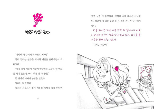 알리는 지루한 여름 방학이 끝나 갈 무렵, 우연히 낡은 램프를 손에 넣게 됩니다. 그런데 놀랍게도 그 램프 안에는 소원을 들어주는 램프의 요정, 리틀 지니가 살고 있었지요. 알라딘의 요술 램프 안에는 우락부락 힘이 센 커다란 요정이 살고 있었지만, 알리의 앞에 나타난 리틀 지니는 커다란 아저씨 요정이 아닌, 앙증맞은 멋쟁이 꼬마 숙녀랍니다.