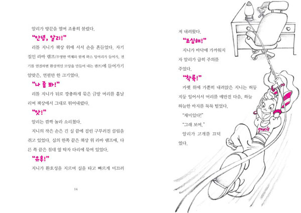 어느 날 방을 분홍색으로 꾸미고 싶어진 알리는 리틀 지니에게 분홍색 방을 갖게 해 달라고 소원을 빕니다. 그런데 이게 웬일, 알리의 소원을 잘못 알아들은 리틀 지니 덕분에 알리가 만지는 것마다 모조리 분홍색으로 변하고 맙니다. 마법의 모래시계 속 분홍빛 모래 알갱이가 바닥에 다 떨어져야만 알리의 소원도 효력이 다하지요. 그때까지 알리는 ‘분홍빛’ 손가락을 감추고 무사히 보낼 수 있을까요? 신비로운 램프 속 조그마한 요정 지니와, 분홍빛 세상에 갇힌 알리가 펼치는 놀랍고도 굉장한 이야기를 지금부터 만나 보세요.