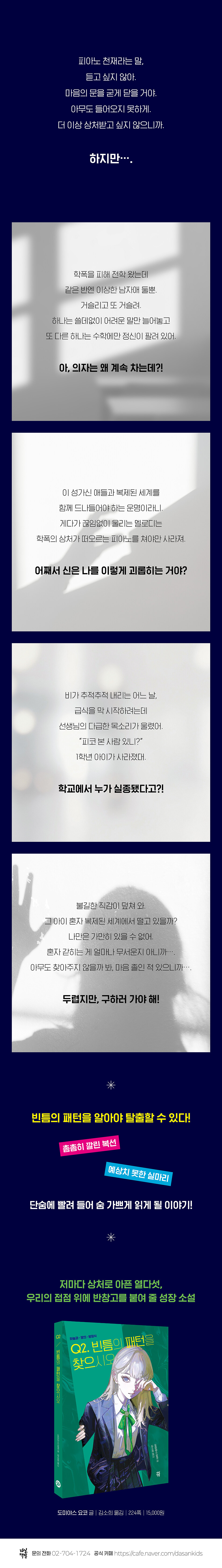 30년 넘게 다양한 책을 써 온 베스트셀러 작가, 도미야스 요코의 청소년 소설이 출간되었다. 〈하늘과 땅의 방정식〉 시리즈는 특별한 재능을 가진 아이들이 복제된 세계의 빈틈을 찾아 재앙에서 세상을 구하는 이야기다. 두 번째 권 《Q2. 빈틈의 패턴을 찾으시오》는 저마다 상처로 힘들어하던 아이들이 모험 속에서 두려움을 극복하고 소중한 것을 지키내는 이야기를 박진감 넘치게 그린다.