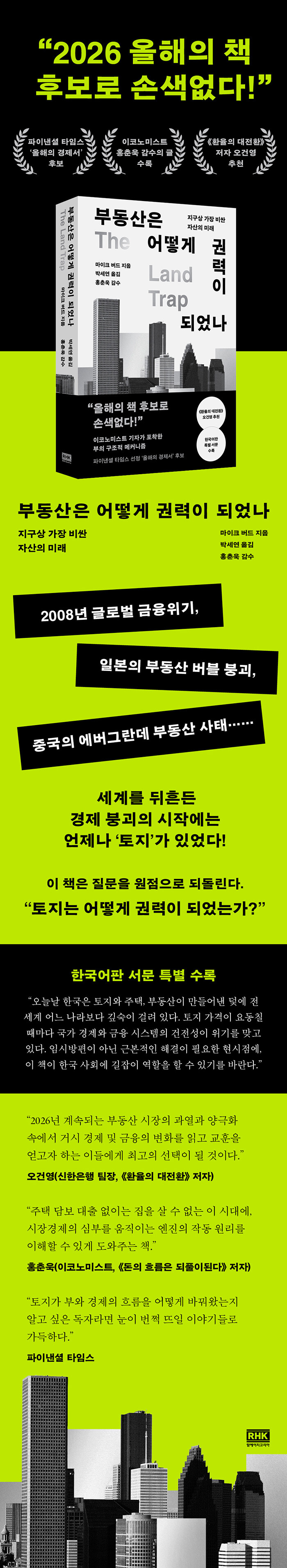 2026년 현재 우리는 무엇을 놓치고 있는가부동산은 새로 만들어낼 수 없고 이동할 수 없으며 시간이 지나도 가치가 떨어지지 않는다는 점에서 주식, 금, 채권, 비트코인 등 지구상에 존재하는 모든 자산의 총합을 뛰어넘는 가장 비싼 자산이다. 저자는 이 책에서 토지가 돈과 얽히면서 만들어지는 공고한 권력 구조를 ‘토지의 덫The Land Trap’이라고 하는데, 한마디로 부동산 가격에 따라 승자와 패자가 발생하게 되는 현상을 가리킨다. 부동산 가격이 오르면 땅을 가진 자와 못 가진 자의 불평등이 심해지고, 가격이 내려가면 신용이 순식간에 증발하면서 금융위기와 같은 재앙을 겪게 된다. 이러한 일련의 일들은 하나의 구조로 굳어진다. 같은 서울 땅에 살아도 땅값에 따라 완전히 다른 세상인 현실과 2008년 글로벌 금융위기, 일본의 장기 침체, 중국의 헝다 부동산 사태 등의 세계적인 사례가 이를 증명한다. 왜 특정한 지역만 부동산 가격이 폭등하는지, 왜 불평등은 토지에서 시작되는지, 왜 금융위기가 반복되는지 등 방대한 역사 데이터가 바탕이 된 날카로운 기자의 시선을 따라 읽다 보면 자연스레 한국 사회의 부동산 문제와 만나게 된다.