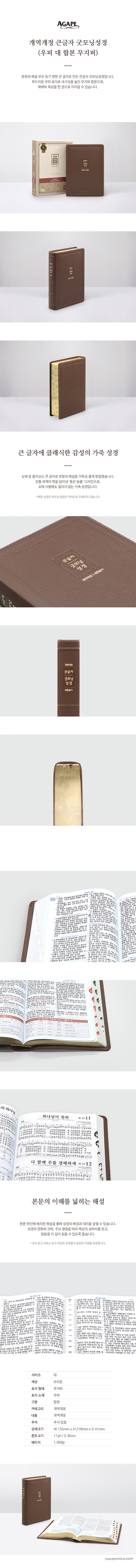 본문과 해설을 모두 읽기 편한 큰 글자로 편집한 큰글자 굿모닝성경이다. 눈에 잘 들어오는 서체로 가독성을 높였고, 예수님 말씀은 적색 인쇄로 구분했다. 예배와 묵상을 한 권으로 이어갈 수 있도록 무지퍼 합본으로 제작했다.