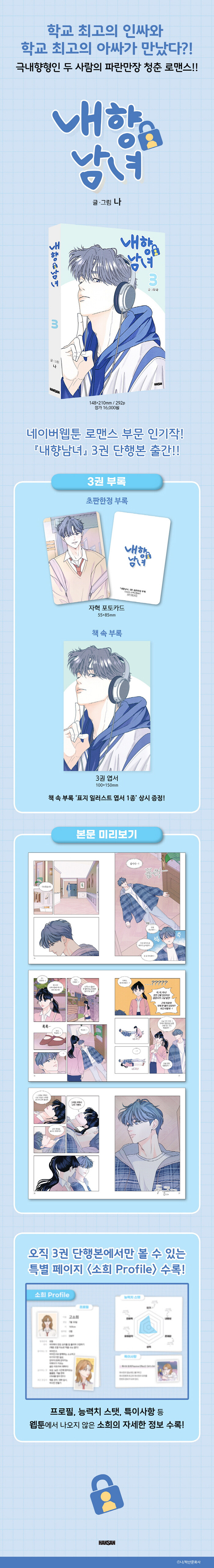 두 사람의 쌍방 오해와 그 속에서 피어나는 푸릇푸릇한 로맨스! <간 떨어지는 동거>로 많은 독자를 설레게 만든 나 작가의 신작 『내향남녀』가 드디어 단행본으로 출간된다. MBTI 검사에서 내향성 99.99%가 나와도 이상하지 않을 극내향형 두 사람의 청춘 로맨스 이야기를 담은 이 작품은 개성 넘치는 등장인물과 흥미진진한 전개로 큰 인기를 끌고 있다. 청춘 남녀의 설렘 가득한 로맨스뿐만 아니라, 소소한 개그 포인트와 감동적인 우정 이야기까지 담고 있어 매력적인 작품이다.