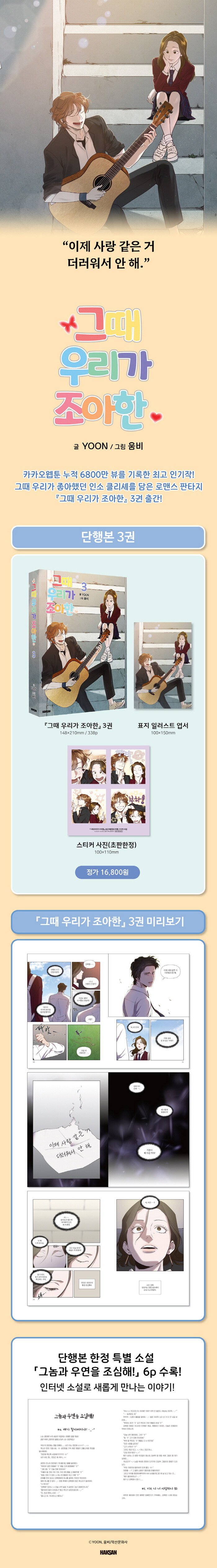 그때 우리가 좋아했던 인소 감성으로 다시 한번!카카오웹툰 누적 6800만 뷰를 기록하며 여전히 독자들의 뜨거운 사랑을 받은 로맨스 판타지 웹툰 〈그때 우리가 조아한〉의 단행본 3권이 출간된다. 2000년대 초 인터넷 소설 특유의 감성과 세계관을 현대적으로 풀어낸 이 작품은 판타지와 현실을 넘나드는 설정 속에서 사랑과 우정, 그리고 성장의 순간들을 촘촘하게 보여주면서 큰 호평을 받았다. 완결 이후에도 여전히 회자되는 이유는 단순한 로맨스를 넘어 ‘그 시절 우리가 가졌던 감정’을 생생하게 그려내기 때문이다.