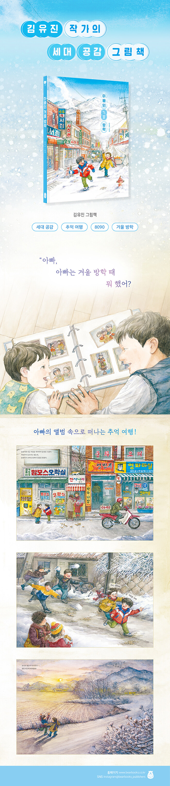 《아빠의 겨울 방학》은 오래된 앨범처럼 독자를 30년 전쯤으로 데려가 줍니다. 오늘날과 같은 듯 다른 풍경 속에서 어린이는 어린 엄마 아빠를 만나고, 어른은 그리운 풍경들과 마주하게 됩니다. 늘 긴장하거나 정색하고 찍는 앨범 속 사진에서는 좀처럼 만나기 힘든 풍경을 말이지요.