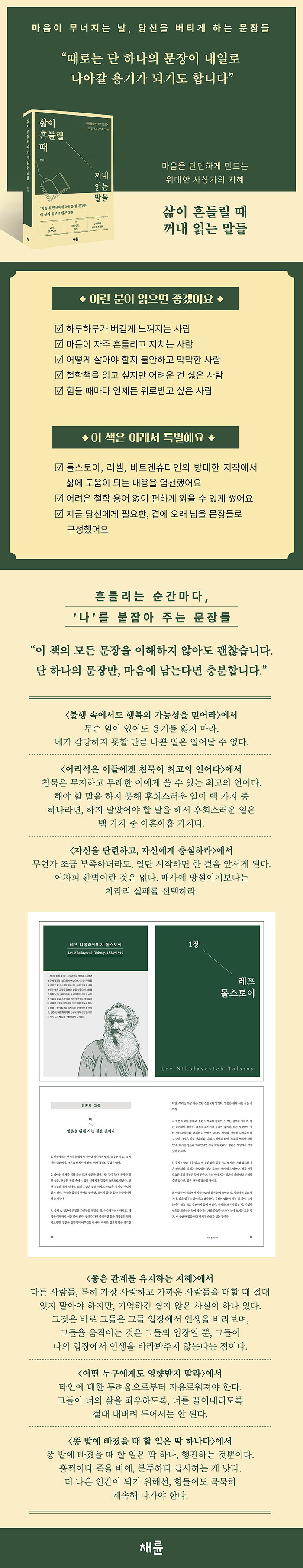 살다 보면 마음이 무너지는 날이 온다. 짐짓 괜찮은 척 일상을 이어 가지만, 사실은 누군가의 위로가 간절해지는 때. 이 책은 그런 순간, 그런 감정을 묵묵히 누르며 사는 사람들을 위해 만들어졌다. 톨스토이, 러셀, 비트겐슈타인. 삶에 대한 사유를 끝까지 놓지 않았던 세 사상가의 글을 바탕으로, 오늘의 당신에게 필요한 문장을 골라 쉽게 읽을 수 있도록 썼다.