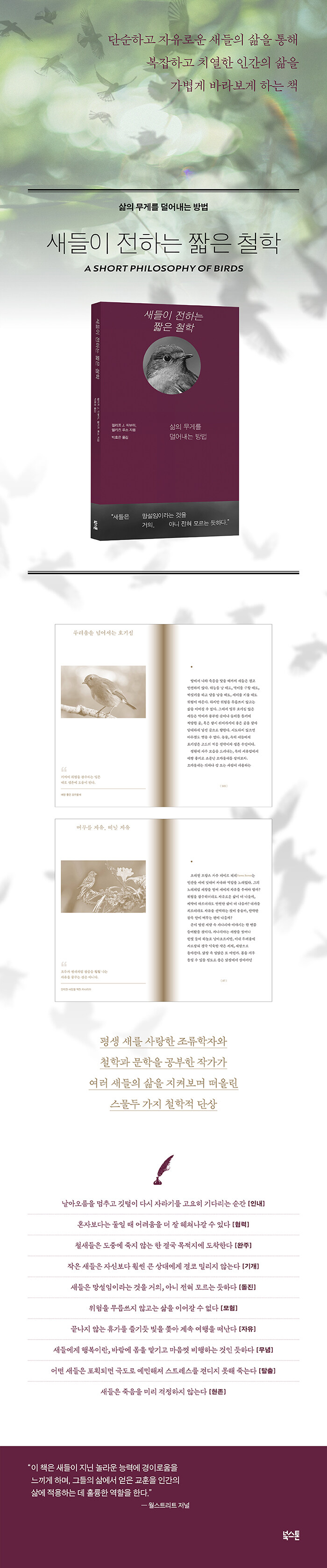 이 책은 조류학자의 시선으로 여러 새들의 삶을 관찰하며, 인간 세계에 적용해볼 만한 22편의 철학적 단상을 담고 있다. 치열하게 애쓰지 않으면 뒤처질 것 같은 시대, 끊임없이 스스로를 몰아붙이는 일상 속에서 우리 주변의 새들은 다른 선택지를 보여준다. 반드시 강해지지 않아도 되고, 늘 앞서 나가지 않아도 되며, 두려울 땐 언제든 훌훌 떠나도 된다는 사실을 말이다.