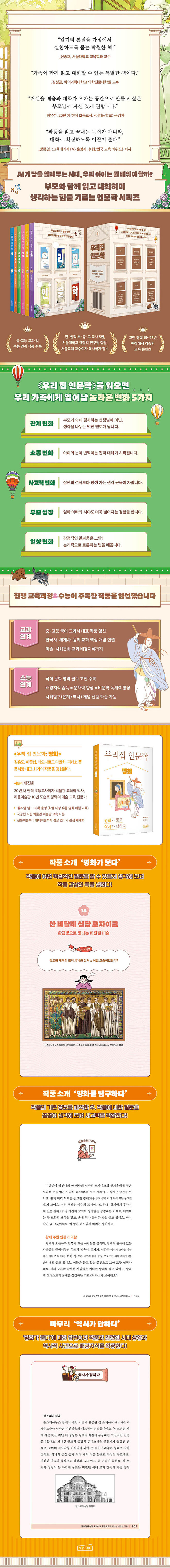 부모와 아이가 함께 읽고 생각을 나누는 다정한 가정 독서 “AI 시대, 인문학으로 생각하는 힘을 길러 자녀의 경쟁력을 높인다”<우리 집 인문학> 시리즈는 부모와 아이가 함께 읽고 대화하도록 이끄는 인문교양서다. 시, 한국소설, 세계소설, 철학, 명화, 영화 총 6권으로 구성되어 있다. 인문학 텍스트를 매개로 작품 속 질문을 출발점으로 삼아, 그 작품이 탄생한 역사적 맥락과 사회적 배경을 함께 탐구하도록 설계되었다. 우리 집 인문학: 명화는 부모와 아이가 동서양 대표 화가 30인의 작품을 함께 감상하며 대화할 수 있도록 안내하는 책이다. 이 책은 작품을 ‘이야기’로 읽고, 그 시대를 ‘사람’으로 이해하는 방식으로 접근하여 독자가 유물과 명화를 더 가깝게 느끼도록 구성했다. 이를 통해 독자는 작품을 감상하는 데 그치지 않고, 작품과 관련된 시대 배경 이야기가 나온 이유와 그 시대 사람들은 무엇을 고민했는지를 입체적으로 이해할 수 있다.