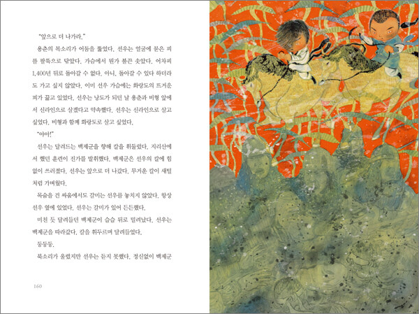 불우한 여러 환경 요인을 갖는 주인공 선우에게 감정을 이입해 억눌리고 갑갑한 처지에 공감하기도 하고, 신라의 화랑으로서 전투에 참가해 친구를 구하는 호연지기를 느낀다면, 문학적 체험을 통해 억눌린 감정을 정화시키는 긍정적 기능을 발휘하는 계기가 될 것이다. 용기와 자존감을 찾아가는 선우의 이야기에 덧붙여진 이용규 작가의 호방하고 강렬한 색채의 그림은 극적인 효과를 높여 준다. 초등 고학년 어린이들에게 추천할 만한 하다.