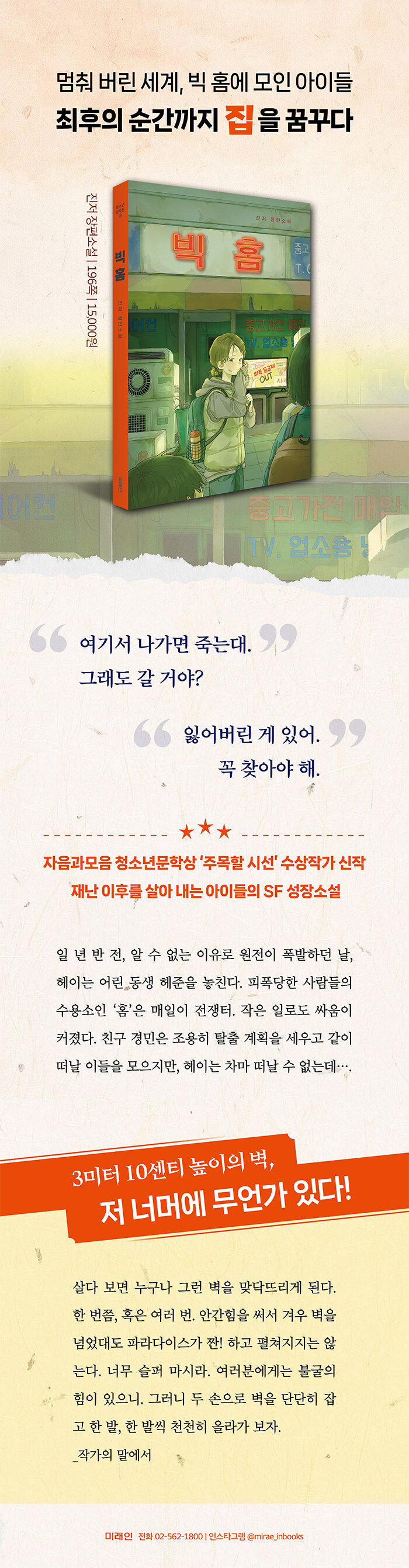 자음과모음 청소년문학상 ‘주목할 시선’ 수상작가 신작알 수 없는 이유로 원전이 폭발하고, 피폭 생존자들이 모인 거대한 수용소 ‘홈’은 아이들에게 유일한 생존 공간이자 또 다른 감옥이다. 사소한 갈등도 폭력으로 번지고, 숱한 죽음 앞에 불안과 공포를 느끼며 하루하루를 버틴다. 이곳에서 아이들은 서로를 의심하면서도 함께 탈출할 계획을 세운다. 주인공 헤이는 폭발이 있던 날 잃어버린 동생을 찾을 때까지 ‘홈’에 남겠다며 절친 경민의 탈출을 만류한다.