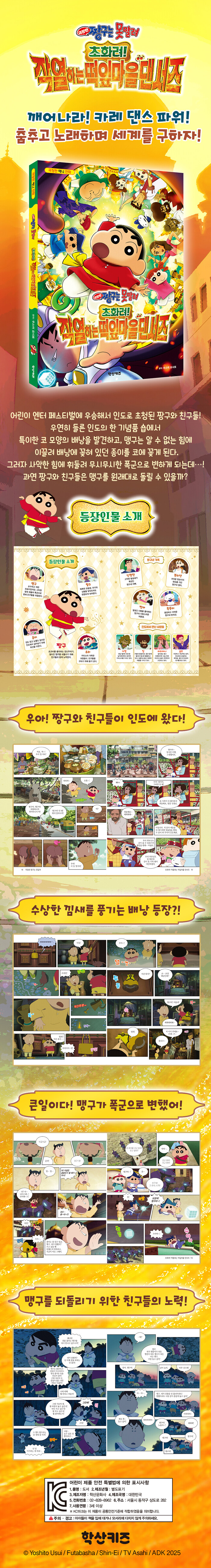 인도 요가바이라는 도시와 떡잎마을이 자매결연을 맺은 기념으로 열리게 된 엔터 페스티벌! 이 페스티벌에서 우승하면 인도로 초청되어 현지 무대에서 춤을 출 수 있게 된다. 이 좋은 기회를 놓칠 리 없는 짱구와 친구들은 열심히 연습해 떡잎유치원 대표로 엔터페스티벌에 나가게 되고, 결국 우승하여 인도에 초청된다. 설레는 마음으로 인도 여기저기를 구경하던 짱구와 맹구는 어딘지 수상한 냄새를 풍기는 기념품 가게를 발견하고, 그곳에서 커다란 코 모양의 배낭을 구매한다.