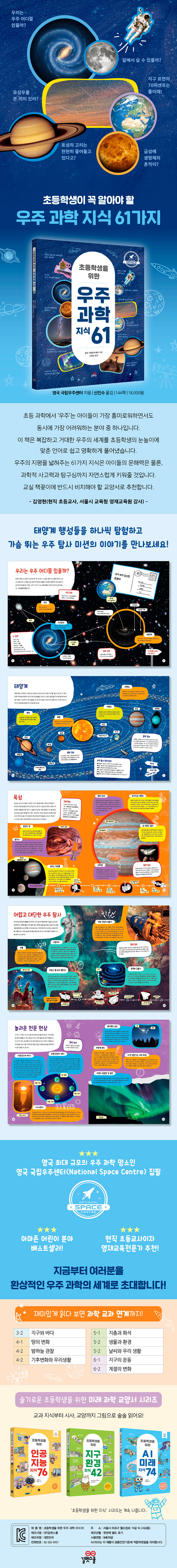 영국 최대 규모의 우주 과학 명소인 영국 국립우주센터(National Space Centre)가 직접 집필하여 전문성과 신뢰도를 높였으며, 눈길을 사로잡는 생생한 풀컬러 사진과 핵심만 짧은 글줄로 구성해 저학년 독자도 막힘없이 읽을 수 있다.