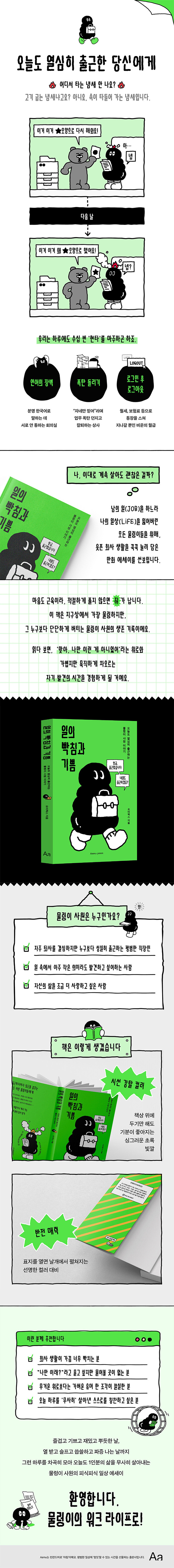 “조금 서툴고 덜렁대 보여도 내가 잘하는 방식으로 멀리 갈 수 있기를”모니터 앞의 모든 ‘물렁이’들에게 전하는 따뜻한 응원물렁이 사원은 일과 나 사이의 ‘건강한 거리’에 대해 묻는다. 인생은 너무 희망차지도, 그렇다고 너무 비관적이지도 않은 그 어느 지점에서 계속 된다고 말하며 그 미묘한 균형 잡기의 순간들을 생생하게 그려내고 있다.