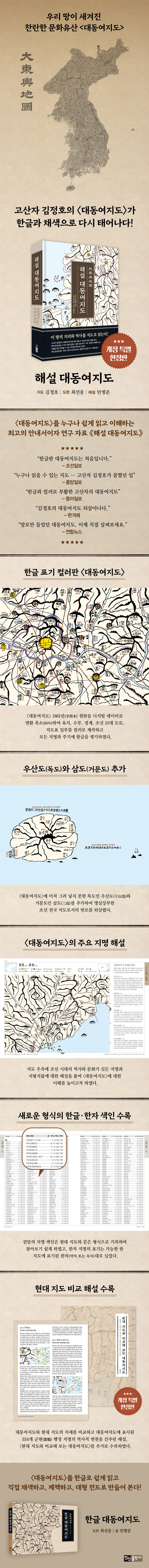 과거와 현재를 이어 주는 길라잡이, 《해설 대동여지도》우리나라 사람이라면 누구나 알고 있는 <대동여지도>는 과학적이며 실용적인 역사상 최고의 지도로 손꼽힌다. 그 내용이나 특징, 가치 등에 관해서는 그동안 많은 학자나 전문가에 의해 연구되고 기록되어 왔으나, 정작 누구나 대동여지도를 쉽게 보고 읽을 수 있는 여건은 마련되지 못하였다. 산줄기와 물줄기, 도로와 기호 등이 모두 먹색으로 되어 있어 구분이 쉽지 않고, 무엇보다 지명이 한자, 그것도 약자나 속자로 기록되어 이해하기 어렵다.