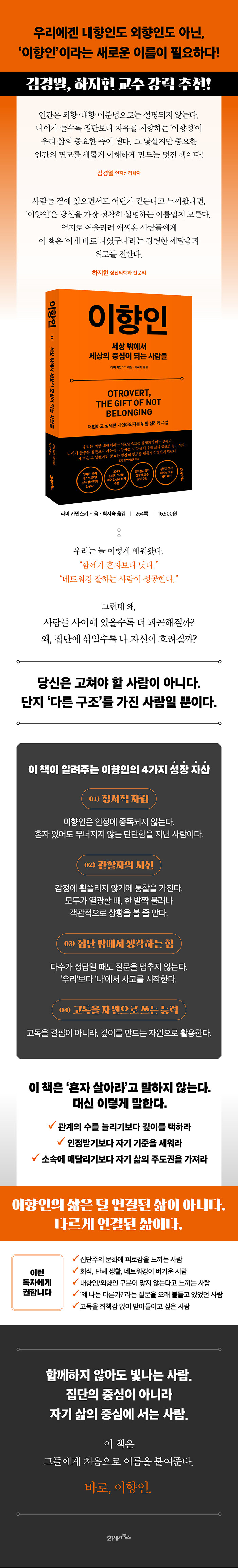 당신이 이향인이든 아니든 가장 지속하는 관계는 바로 자기 자신과의 관계다. 그 관계를 단단히 하면, 타인을더 깊이 이해하고 타인과 연결될 수 있는 마음의 여유와 에너지를 얻을 수 있다. 그것도 당신만의 방식으로 말이다. 자신의 삶을 집단의 평가에 맡기는 것은 결국 행복에 대한 주도권을 포기하는 것과 같다. 철학자 프리드리히 니체가 말했듯, “자유란 자신을 책임지려는 의지다.” 부디 이책을 통해 당신이 내적 자유를 찾을 수 있길 바란다.
