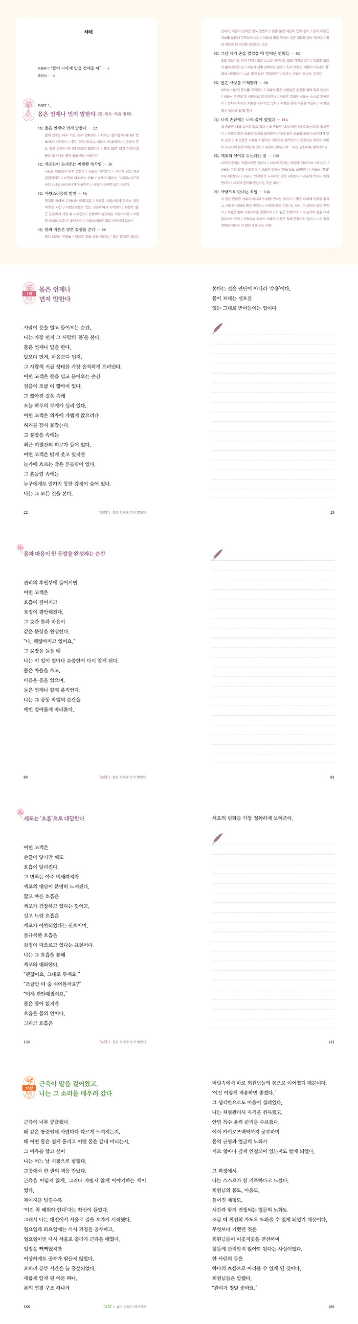 몸이 남기는 문장들 / 마음도 몸을 따라 적힌다 / 몸이 닫히면 마음이 닫히고, 마음이 닫히면 몸도 닫힌다 / 몸을 풀면 마음이 먼저 운다 / 몸과 마음은 서로를 조용히 부축하며 산다 / 사람의 몸을 만지는 것은 마음을 읽는 일이다 / 몸과 마음이 한 문장을 완성하는 순간