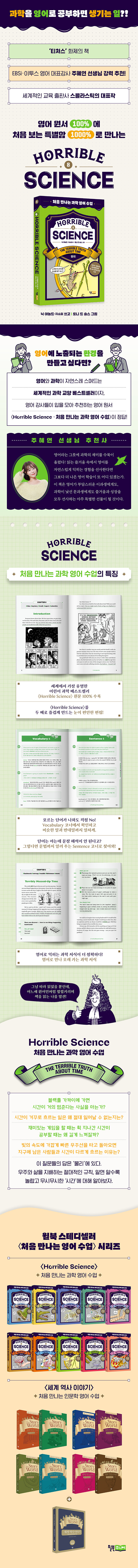 이번에 새롭게 출간된 『Horrible Science: 처음 만나는 과학 영어 수업』은 스콜라스틱과 정식 라이선스 계약 아래 탄생한, 이 명성 높은 과학 시리즈의 국내 유일 ‘원서 리딩 학습서’다. 영어가 어려운 이과 성향의 학생, 과학이 낯선 문과 성향의 학생 모두에게 즐거운 경험을 선사할 책으로 주혜연 선생님이 강력 추천했다.