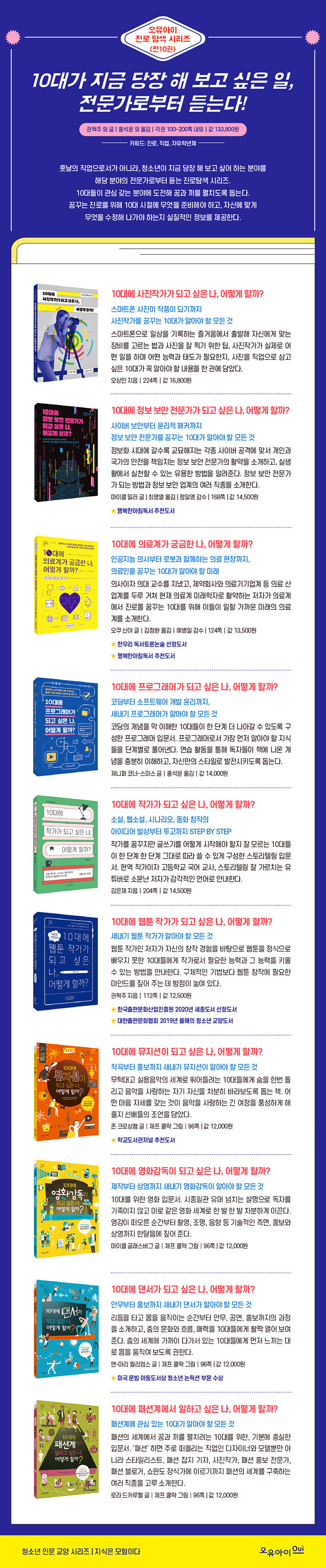 스마트폰으로 일상을 기록하는 즐거움에서 출발해 자신에게 맞는 장비를 고르는 법과 사진을 잘 찍기 위한 팁, 사진작가가 실제로 어떤 일을 하며 어떤 능력과 태도가 필요한지, 저작권과 초상권 같은 필수 상식까지 사진을 직업으로 삼고 싶은 10대가 꼭 알아야 할 내용을 한 권에 담았다. 단지 ‘멋있어 보이는 직업’이라는 환상 대신 업(業)으로서의 사진이 지닌 기쁨과 슬픔, 보람과 고단함, 책임 의식과 꾸준한 루틴을 진솔하게 이야기한다. 언론사 사진 기자를 거쳐 지금은 ‘천막사진관’을 운영하는 오상민 작가가 18년 동안 현장에서 쌓은 경험을 바탕으로 10대가 품는 현실적인 질문에 솔직하게 답한다.