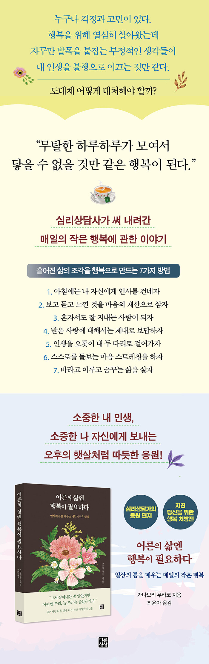 이 책 《어른의 삶엔 행복이 필요하다》는 걱정과 고민에 힘겨워하는 사람들을 위한 에세이이다. 심리상담가로 오랜 시간 활동해온 저자 유연하지만 단단한 해결책과 함께 일상에 숨겨진 작은 행복을 찾는 비결을 일러준다.