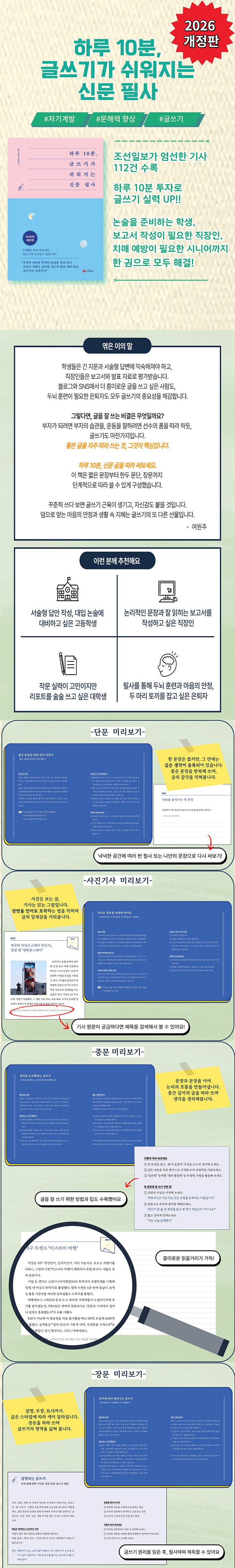 "부자가 되려면 부자의 습관을 따라 하고, 운동을 잘하고 싶다면 선수의 폼을 따라 하라. 글쓰기도 마찬가지!" 조선일보의 명문장, 기사, 사진기사를 3개월만 따라 써 보자. 글쓰기에 자신감이 생길 것이다.흔히 ‘문자의 시대’가 저물고 ‘영상의 시대’가 왔다고 말합니다.버스를 기다리는 사람도, 지하철을 이용하는 승객도 휴대전화 속 영상에 몰두하는 모습이 익숙해졌지요.그러나 세대마다 이유는 다르지만, 글쓰기의 필요성은 여전히 유효하다는 의견이 많습니다.학생들은 긴 지문과 서술형 답변에 익숙해져야 하고, 직장인들은 보고서와 발표 자료로 평가받습니다.블로그와 SNS에서 더 흥미로운 글을 쓰고 싶은 사람도, 두뇌 훈련이 필요한 은퇴자도 모두 글쓰기의 중요성을 체감합니다.그렇다면, 글을 잘 쓰는 비결은 무엇일까요?부자가 되려면 부자의 습관을, 운동을 잘하려면 선수의 폼을 따라 하듯, 글쓰기도 마찬가지입니다.좋은 글을 자주 따라 쓰는 것, 그것이 핵심입니다.신문에는 주장을 펼치고, 정보를 설명하고, 감정을 어루만지는 다양한 글이 가득합니다.하루 10분, 신문 글을 따라 써보세요.이 책은 짧은 문장부터 한두 문단, 장문까지 단계적으로 따라 쓸 수 있게 구성했습니다.꾸준히 쓰다 보면 글쓰기 근육이 생기고, 자신감도 붙을 것입니다.덤으로 얻는 마음의 안정과 생활 속 지혜는 글쓰기의 또 다른 선물입니다.- 프롤로그 중에서