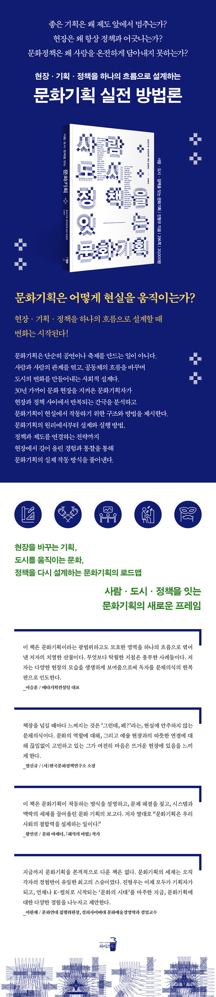또한 문화기획이 아이디어에 머물지 않고 현실에서 작동하도록 ‘25개 재료와 3개 원칙’을 통해 설계 방법을 안내한다. 권위주의 시기부터 문화의 민주화 과정, 블랙리스트 사건, K-컬처 정책까지 한국 문화정책의 흐름을 살피며 문화기획이 사람과 도시, 공동체와 정책을 연결하는 사회적 실천 전략임을 보여준다.