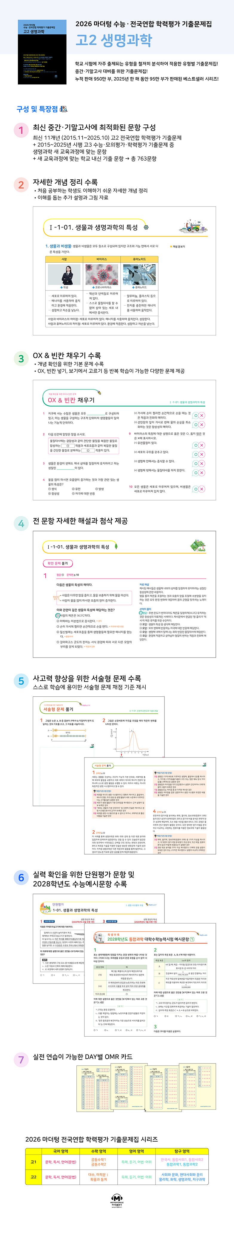 최신 11개년(2015.11~2025.10) 고2 전국연합 학력평가 기출문제와 2015~2025년 시행 고3 수능·모의평가·학력평가 기출문제 중 생명과학 새 교육과정에 맞는 문항을 선별했다. 새 교육과정에 맞는 학교 내신 기출 문항까지 더해 총 763문항을 수록했다.
