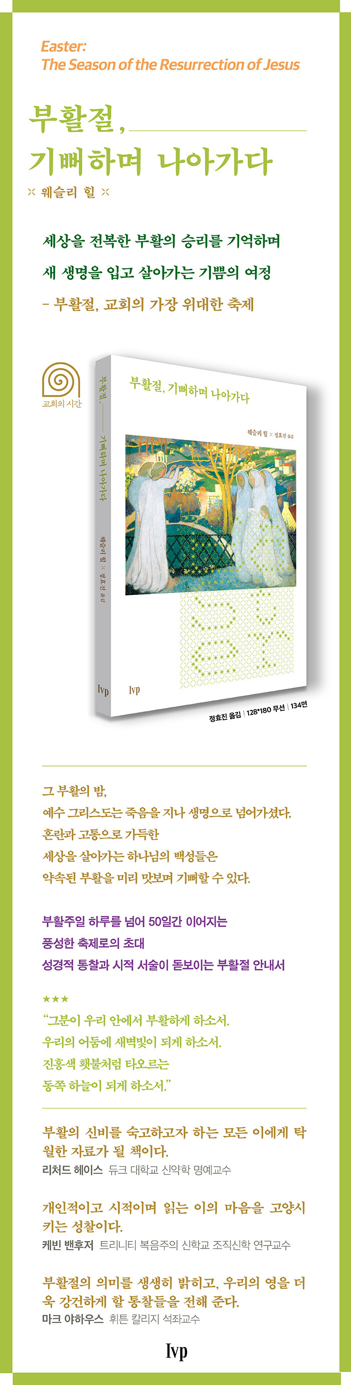 기쁨의 50일을 여는 부활절 안내서40일간의 사순절이 마무리되는 성토요일 밤, 인간의 몸을 입고 죽음으로 내려가신 예수 그리스도를 기억하는 슬픔과 두려움으로 뒤덮인 시간. 빈 무덤의 소망이 해처럼 떠오른다. “그가 살아나셨다”는 놀라운 소식과 함께 예기치 않게 부활절은 시작된다. 그리스도가 죽음을 지나 생명으로 넘어가신 주님의 유월절, 모든 신자의 부활을 예비하는 그리스도의 부활을 기념하는 부활절은 교회의 가장 크고 위대한 축제다.