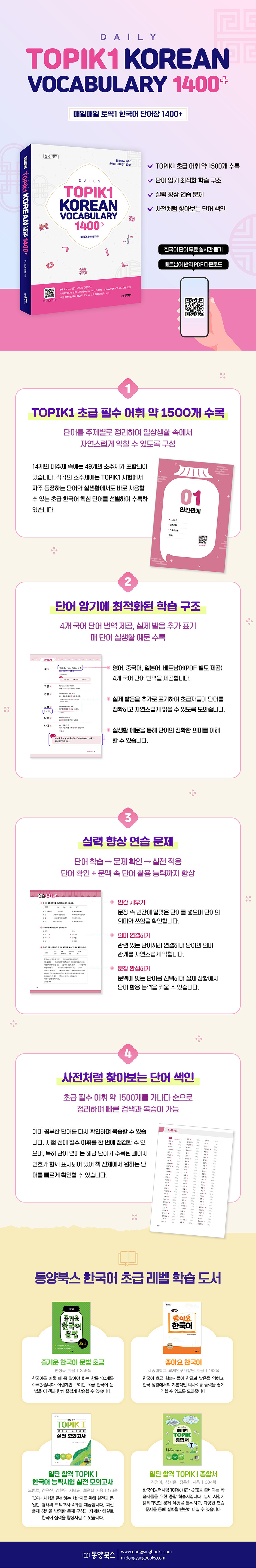 한국어를 처음 배우는 학습자부터 TOPIK I 시험을 준비하는 학습자까지, 한국어 기초 어휘를 탄탄하게 다지고 싶은 외국인 학습자를 위한 실용적인 단어장이다.