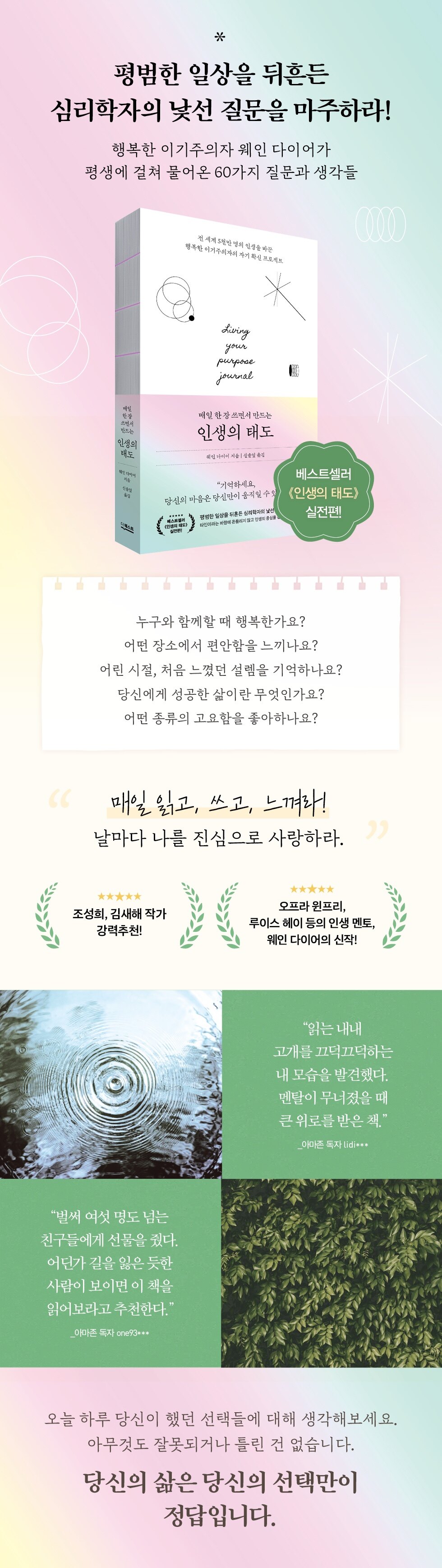 카페든, 집이든 혼자서 조용히 있을 시간을 택해 다이어 박사의 질문에 마주하세요. 어떤 답은 쉽게 나올 것이고, 어떤 답은 오래 생각해도 잘 나오지 않을 수 있습니다. 상관없어요. 오래 생각하게 하는 그 질문이 당신의 진짜 마음을 들여다보게 하는 보석 같은 질문입니다. 그 질문들을 하나씩 따라가다 보면 잊고 있었던 본래 모습을 발견할 수 있게 됩니다.