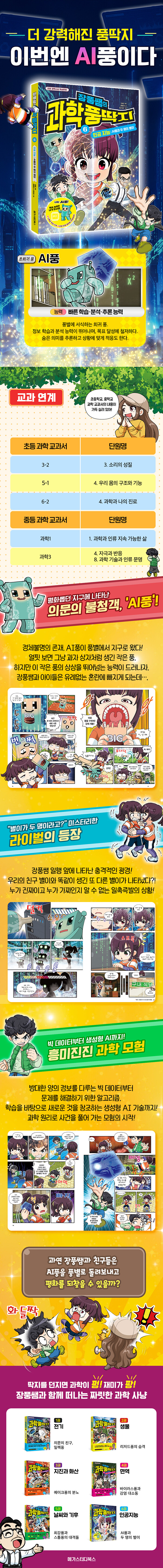 <장풍쌤의 과학 풍딱지> 시리즈는 풍별에서 지구로 온 풍들 때문에 장풍쌤과 주인공 아이들 주변에 불미스러운 사건이 생기고, 딱지와 과학 지식을 통해 그들을 원래 있던 풍별로 돌려보내는 스토리이다. 전기, 생물, 지진과 화산, 바이러스 등 다양한 과학 주제를 흥미진진한 모험 속에서 배워 온 장풍쌤과 아이들. 매 권마다 독특한 ‘풍’과의 만남을 통해 과학의 원리를 알아 갔다. 6권은 장풍쌤과 단비 이모가 풍에 관한 빅 데이터 시스템인 ‘풍템’을 개발하면서 시작된다. 풍의 정보를 모두 파헤치기 위해 만든 이 시스템을 시험하려고 장풍쌤과 아이들은 게임 회사로 향한다. 하지만 그곳에서 예상치 못한 사건이 벌어진다. 별이가 여러 가지 사고를 치게 되고, 아이들은 별이가 일부러 못된 짓을 했다며 별이에게 불만을 쏟아 낸다. 그러나 풍템을 통해 밝혀진 충격적인 사실. 그 사고를 일으킨 건 별이가 아니라 별이를 복제한 또 다른 존재였던 것. ‘또 다른 별이’는 별이의 목소리와 얼굴, 행동 데이터를 모두 학습한 뒤 별이를 해치겠다는 목표까지 가진 풍이었다.도대체 이 풍은 누구이고, 왜 별이를 노리는 걸까? 아이들은 이 모든 비밀을 밝혀 낼 수 있을까? <장풍쌤의 과학 풍딱지> 는 메가스터디 대표 과학 선생님 장풍이 만든 과학 학습만화 시리즈이다. 이 시리즈는 주인공 어린이들이 우리 주변에서 벌어지는 다양한 과학 현상을 경험하며, 기초 과학의 원리를 하나씩 알게 되는 과정으로 전개된다.어린이 독자들 또한 주인공들의 모험을 따라가다 보면, 자연스럽게 과학 지식을 깨닫게 될 것이다. 현실과 판타지가 교묘히 섞여 있는 스토리를 읽으며 재미와 감동을 동시에 느껴 보자.