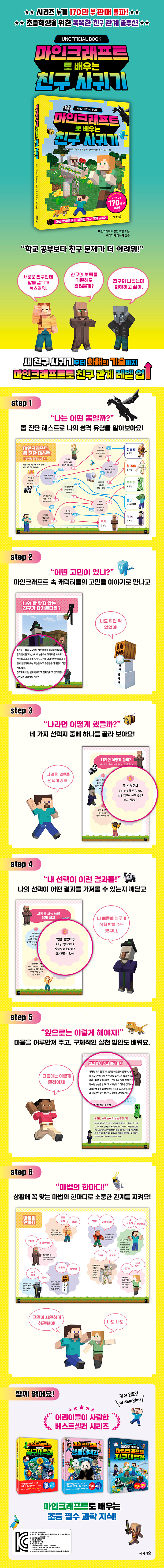 전 세계 어린이들의 인생 게임 ‘마인크래프트’의 세계관을 빌려 아이들이 건강한 인간관계를 맺고 사회성을 기를 수 있도록 도와준다. 학교와 일상에서 겪는 고민들을 마인크래프트 속 캐릭터들의 이야기로 생생하게 보여 주고, “나라면 어떻게 할까?”라는 질문을 통해 아이가 직접 네 가지 선택지 중 하나를 골라보게 한다. 선택에 따른 결과를 미리 확인하며 조언을 얻는 과정은 아이 스스로 갈등을 지혜롭게 다루는 ‘자기 주도적 관계 연습’을 가능하게 한다. 친구 관계를 맺기 시작하는 초등 저학년부터 갈등이 깊어지기 쉬운 고학년까지, 모든 어린이의 마음을 지켜 줄 든든한 친구가 되어 줄 것이다.