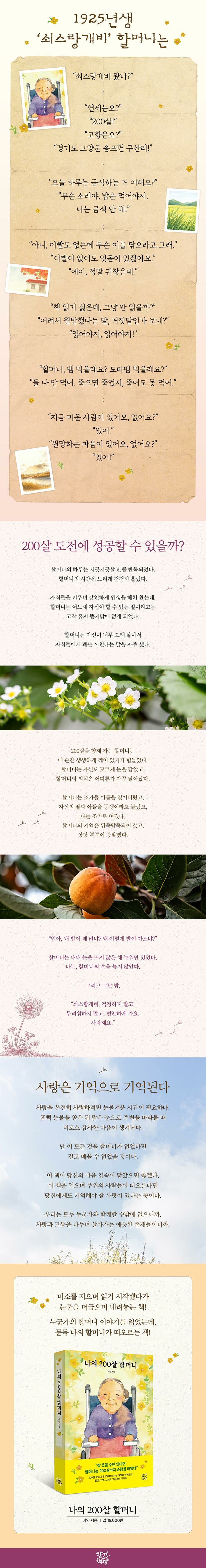 할머니가 100살을 넘어 200살을 향해 간다는 건 꿈같은 일이다. 이 책은 그 꿈같은 일을 할머니의 마지막 100일의 나날들에 담았다. 때로는 웃게 하고, 때로는 미소 짓게 하고, 끝내는 눈가를 촉촉하게 하는, 그래서 어느 순간 내 마음속 할머니가 떠오르게 하는 책이다.