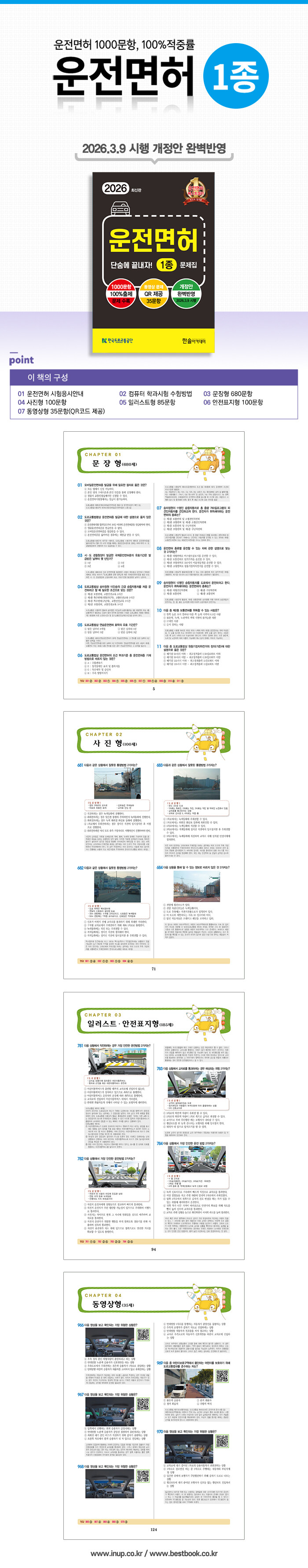 일러스트형(85문)은 시내도로상 돌발상황 및 사고 예방과 안전운전방법, 주의해야 할 위험 요인을 묻는 중요 단원이다. 안전표지(100문)는 도로에서 볼 수 있는 교통신호 표지판과 안전표지, 교통신호 뜻을 묻는 문제가 위주다. 동영상형(35문항)은 운전 중 일어날 수 있는 위험요소를 묻는 문제가 출제된다.