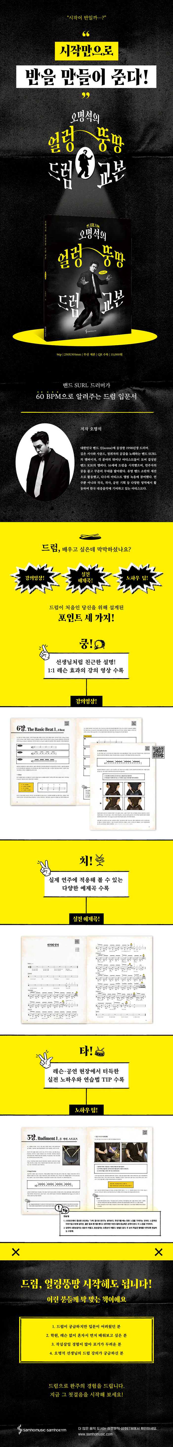 옆에서 친근하게 말을 걸어오는 듯한 설명부터, 드럼 선생님에게 1:1로 레슨을 받는 듯한 강의 영상까지. 술술 읽히고, 손이 먼저 움직이게 만드는 드럼 교본이 여러분과 함께한다면 이제 더 이상 미룰 이유도, 포기할 이유도 없을 것이다.