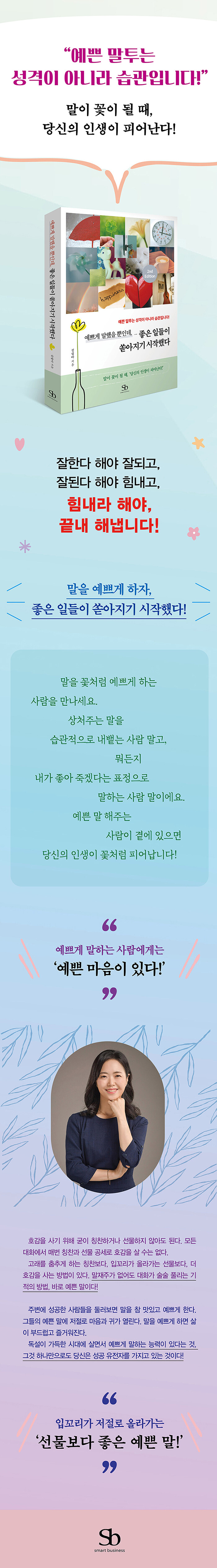 영어교육, 학원관리, 학부모 상담 전문가입니다. 대학 졸업 후 은행에서 근무하며 수많은 고객을 만나면서, 고객의 니즈에 맞는 대화법을 익혔습니다. 이후 교육대학원을 졸업하고 어학원을 운영하며, 아이들의 눈높이에 맞는 소통과 학부모에게 실질적인 도움을 주는 대화 방식을 온몸으로 체득했지요. 그 노력들의 결과로 저자만의 대화법을 완성할 수 있었습니다.지나온 시간을 되짚어보니, 저자가 일궈낸 성공의 8할은 ‘예쁜 말’, ‘칭찬’, ‘긍정’이었습니다. 두 직업을 거쳐 오면서 나름의 말하는 요령, 대화의 기술을 터득한 것이죠. 말 한마디로 격을 높이고, 호감을 얻고, 관계가 좋아지는 일들이 참 많습니다. 하지만 안타깝게도 많은 사람이 이런 경험을 놓치고 있지요.그래서 이 책을 썼습니다. 단순한 것 같지만 어렵고 복잡한 것 같지만 사실은 간단한, 예쁜 말로 완성하는 ‘대화의 에티켓’을 알려드리고 싶었습니다. 진심을 담은 예쁜 말은 당신을 빛나게 하고, 좋은 일들을 가져다줍니다. 주변에 예쁜 말을 건네보세요. 그 말들이 씨앗이 되어 당신의 일상에 ‘예쁜 말의 마법’을 피워낼 거예요.