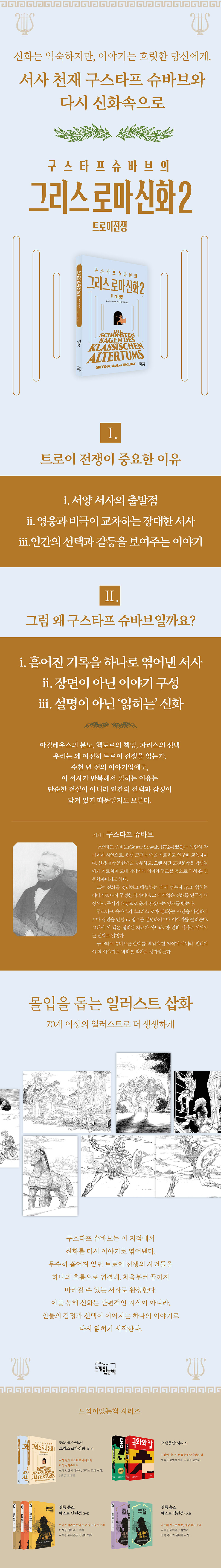서사 천재 구스타프 슈바브와, 다시 신화 속으로 구스타프 슈바브는 이 지점에서 신화를 다시 이야기로 엮어낸다. 무수히 흩어져 있던 트로이 전쟁의 사건들을 하나의 흐름으로 연결해, 처음부터 끝까지 따라갈 수 있는 서사로 완성한다. 이를 통해 신화는 단편적인 지식이 아니라, 인물의 감정과 선택이 이어지는 하나의 이야기로 다시 읽히기 시작한다.