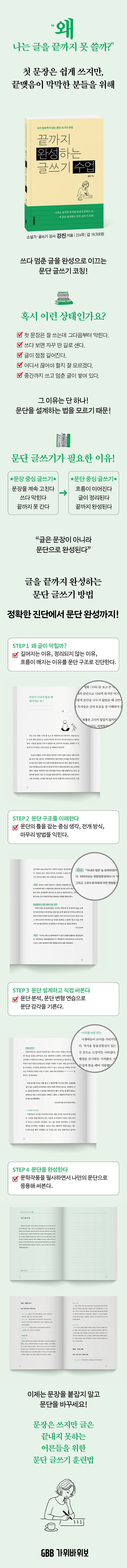 이 책은 문장을 고치는 기술이 아니라 문단을 설계하는 법을 알려준다. 글쓰기의 기본 단위인 문단을 통해 생각을 정리하고 글을 완성하는 방법을 차근차근 안내한다. 문단의 구조를 이해하고, 실제 글을 분석하고, 직접 써보는 과정을 반복할 때 글이 완성되는 경험을 하게 될 것이다. 더 이상 문장을 붙들고 씨름하지 않아도 된다. 문단을 이해하는 순간 글은 훨씬 쉽게 풀릴 것이기 때문이다.