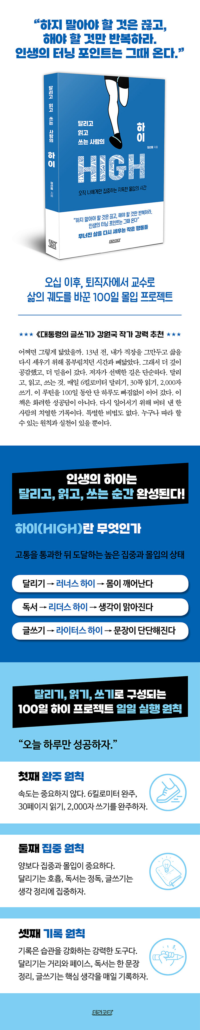 거창한 계획은 없었습니다. 대신 매일 두 발로 걷고 달렸습니다. 매일 책을 읽고, 매일 글을 썼습니다. 그것을 5년 동안 반복했습니다. 결과는 예상 밖이었습니다. 걷고, 달리고, 읽고, 썼을 뿐인데 삶의 방향이 바뀌었습니다. 그 변화의 핵심이 바로 ‘하이’였습니다.