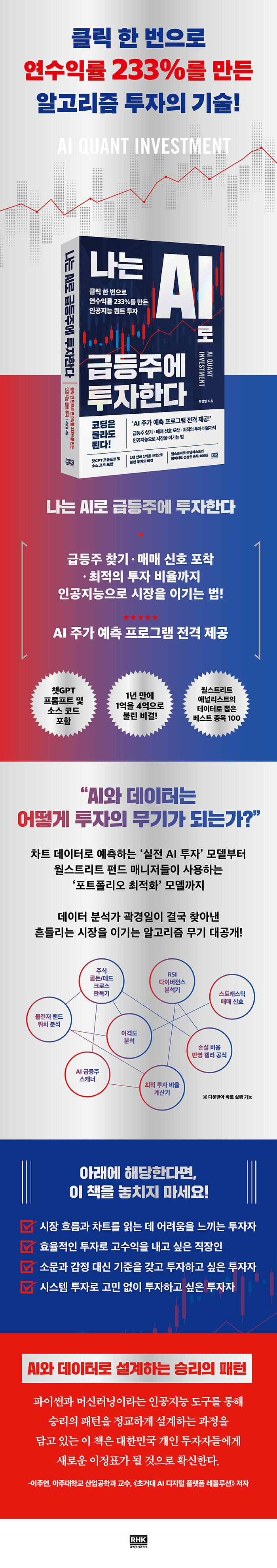 ***AI 주가 예측 프로그램 전격 제공!*** 주식 투자는 어떤 주식을 언제 사고, 팔아야 할지 선택할 때마다 인간의 평정심과 인내력을 시험한다. 대부분의 투자자가 자신의 기준과 원칙을 세워 투자하기보다는 잘 알려진 사람의 의견이나 소문, 혹은 감에 의존해 투자하기 일쑤다. 하지만 AI는 다르다. 데이터 분석을 기반으로 한 AI 퀀트 투자는 손실은 최소화, 수익은 최대화할 수 있는 확률을 냉정하게 계산하고 망설임 없이 투자를 실행시켜 준다. 주식 투자에 인공지능을 활용하는 것이 월스트리트의 전유물로 생각하던 때가 있었다. 초단타매매와 대체 데이터를 활용한 그들의 투자법은 여전히 일반인이 접근하기 어렵지만, 챗GPT와 같은 생성형 AI를 활용해 나만의 투자 비서를 만들고, 머신 러닝 기술로 주가 데이터를 분석해 급등주를 찾는 일은 우리도 가능하다.