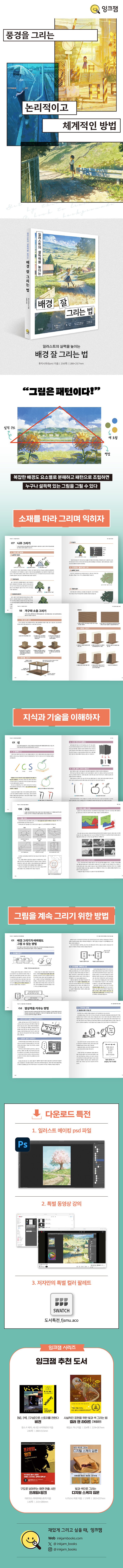 하늘과 구름, 풀 등 배경의 핵심 요소들을 그리는 구체적인 방법을 물론, 그림의 실재감을 살리는 포인트와 효과적인 디지털 도구 활용법이 담겨 있습니다. 특히 한 장의 작품을 완성하는 과정을 담은 ‘일러스트 메이킹’은 그림의 완성도를 높여줄 확실한 가이드가 될 것입니다.