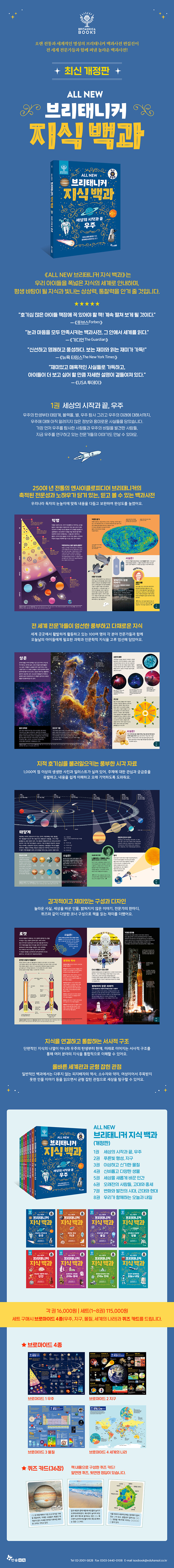 오랜 전통과 명성을 가진 브리태니커 백과사전 편집진이 전 세계 100여 명의 전문가들과 함께 오늘날 아이들에게 필요한 과학과 인문학 지식을 고루 엄선해 담았다. 1권부터 8권까지 우주, 지구, 물질, 생물, 인간, 고대와 중세, 근대와 현대, 오늘과 내일을 아우르며 지식의 큰 흐름을 보여 준다.